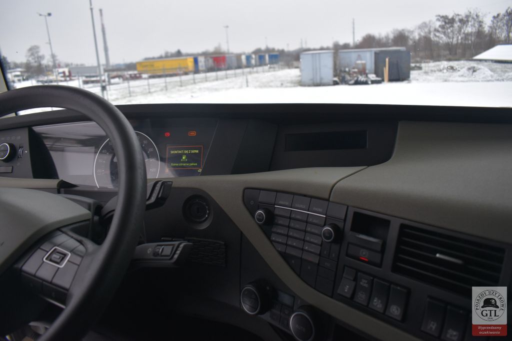 EURO 6, ABS, ASR, 2 łóżka, zwalniacz, klimatyzacja, tempomat, ogrzewanie postojowe (uszkodzone), lusterko rampowe, przekładnia automatyczna, sprzęt holowniczy, fotel kierowcy na poduszce, osłona przeciwsłoneczna, elektryczne szyby, centralny zamek, radio, szyberdach, kabina wysoka, halogen, felgi stalowe, immobiliser, koła 385/65 R22,5, 315/70 R22,5.
