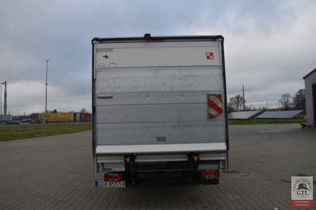 EURO 5, Kontener z windą, ABS, ASR, 3 miejsca, klimatyzacja, przekładnia automatyczna, elektryczne szyby, centralny zamek, radio, felgi stalowe, immobiliser, koła 225/75 R16C, wymiar skrzyni 4880/2180/2000, podest załadowczy DHOLLANDIA 500kg (uszkodzony).