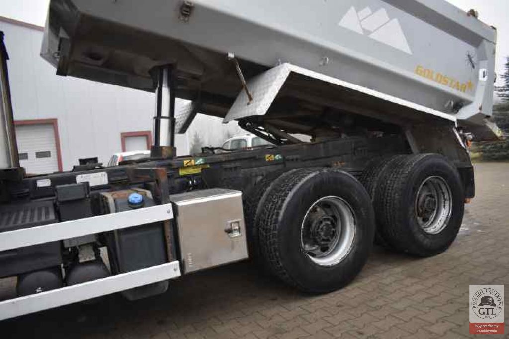Wywrotka jednostronna, EURO 6, ABS, ASR, 2 miejsca, zwalniacz, klimatyzacja, tempomat, ogrzewanie postojowe, lusterko rampowe, hydraulika, 3 osie, przekładnia automatyczna, sprzęt holowniczy, fotel kierowcy na poduszce, osłona przeciwsłoneczna, elektryczne szyby, centralny zamek, radio, szyberdach, kabina niska, halogen, felgi stalowe, immobiliser, koła 385/65 R22,5, 315/80 R22,5.