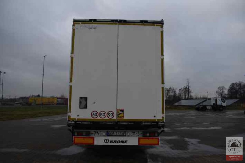 Plandeka, ABS, pneumatyka KRONE, hamulce tarczowe, felgi stalowe, osie KRONE, 3 osie, podnoszona oś, zawieszenie pneumatyczne, podpory JOST, koła 385/65 R22,5.